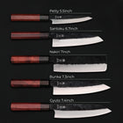 Blade Types: Gyuto (7.1 in / 180mm), Nakiri (7.1 in / 180mm), Petty (5.5 in / 140mm), Santoku (6.7 in / 170mm), Bunka (7.3 in / 185mm)
