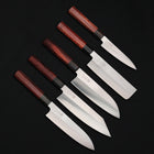 Blade Types: Gyuto (7.1 in / 180mm), Nakiri (7.1 in / 180mm), Petty (5.5 in / 140mm), Santoku (6.7 in / 170mm), Bunka (7.3 in / 185mm)