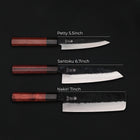 Blade Types: Gyuto (7.1 in / 180mm), Nakiri (7.1 in / 180mm), Petty (5.5 in / 140mm)