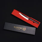 Part of the Kasumi Japan collection, this 5.5-inch Japanese handcrafted Petty knife is designed for serious home cooks who appreciate the art of Japanese bladesmithing. It combines a premium Blue Steel #2 blade with a traditional Red Ebony wood handle, offering exceptional balance, control, and impressive durability.